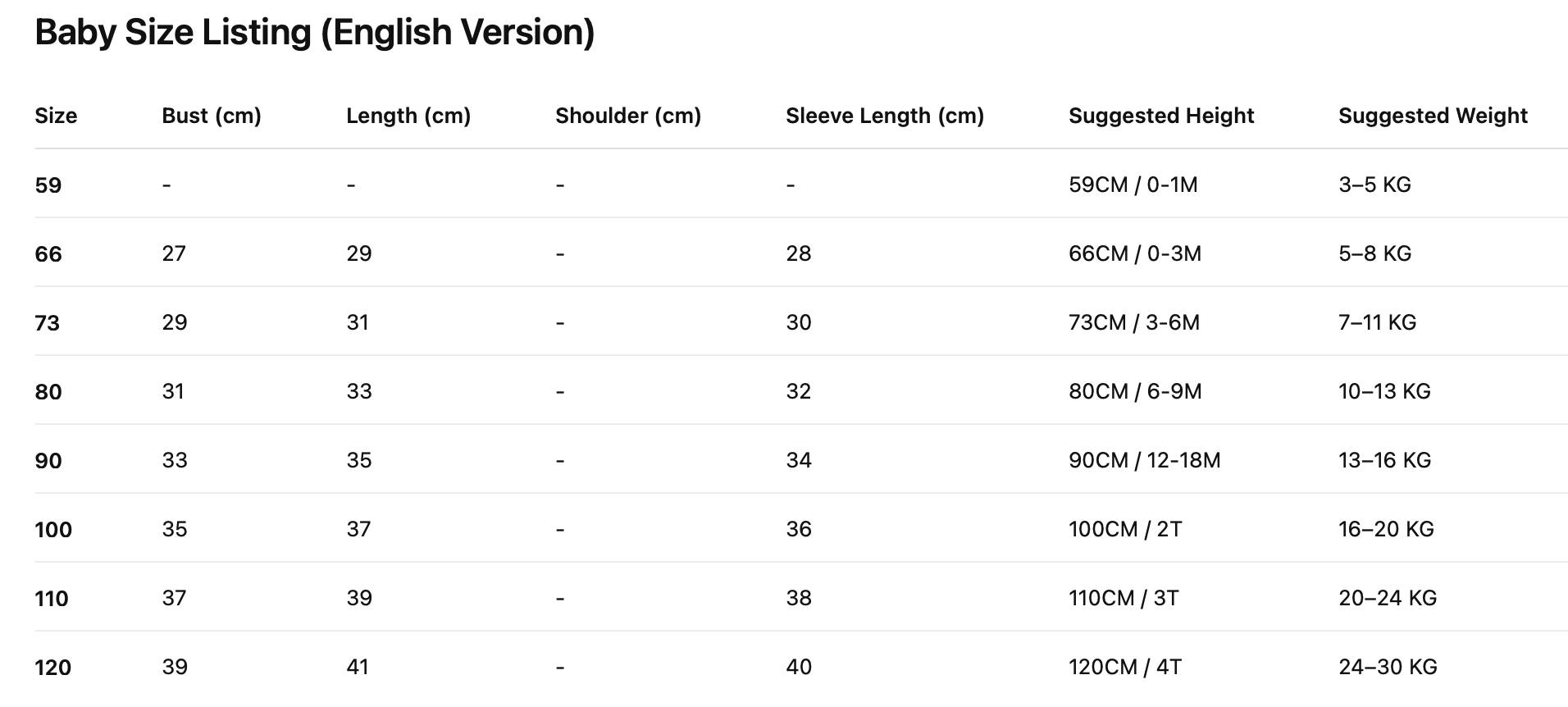 All measurements are taken manually; a 1–3 cm difference is possible.
